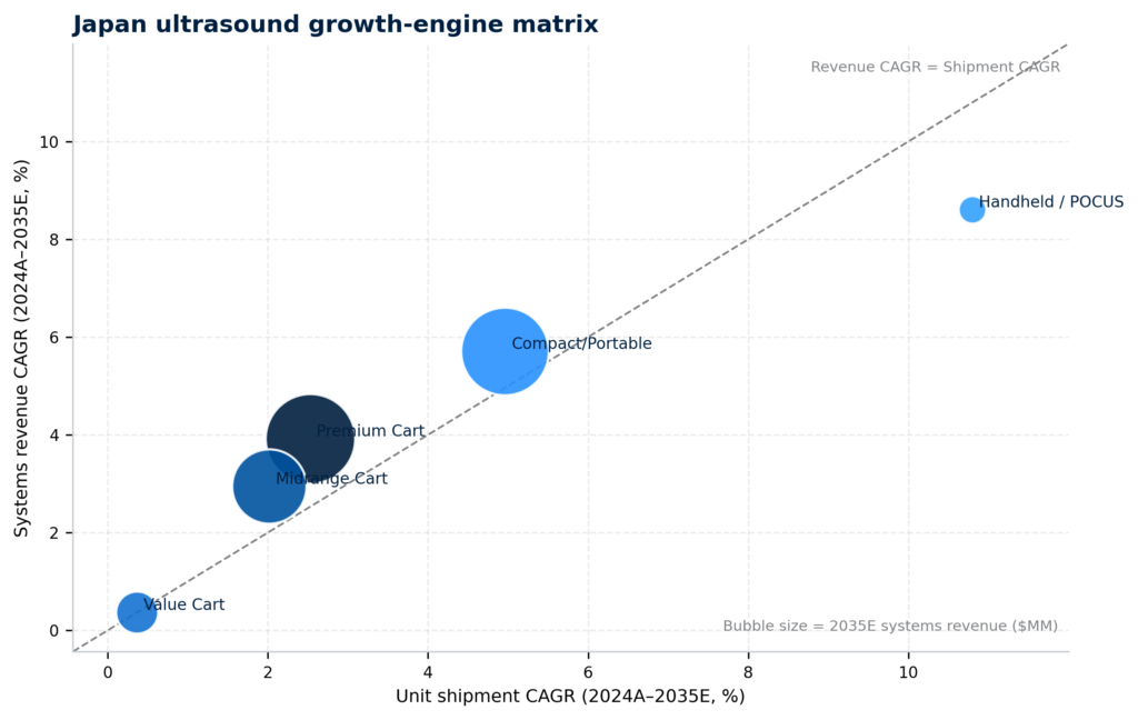 This chart separates volume growth from value growth in one view. Compact / Portable is the main scale growth engine: it is one of the largest bubbles and grows strongly on both axes. Handheld / POCUS is the clearest volume-led expansion engine: it is farthest to the right, with shipment growth materially above revenue growth. Premium Cart and Midrange Cart sit above the diagonal, which means revenue growth modestly exceeds shipment growth and monetization holds up relatively well. Value Cart sits near the origin, confirming that it contributes little to forward growth.