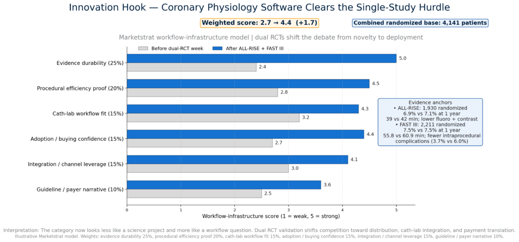 ALL-RISE and FAST III matter together more than either would alone. ALL-RISE showed FFRangio performed similarly to pressure-wire testing in 1,930 patients and was faster with less fluoroscopy and contrast, while FAST III showed vFFR-guided revascularization was noninferior in 2,211 patients across 37 sites in seven European countries, with shorter procedural time and fewer intraprocedural complications. That combination moves the commercial debate away from “does software physiology work?” and toward “who owns cath-lab workflow, installed-base distribution, and reimbursement translation?”