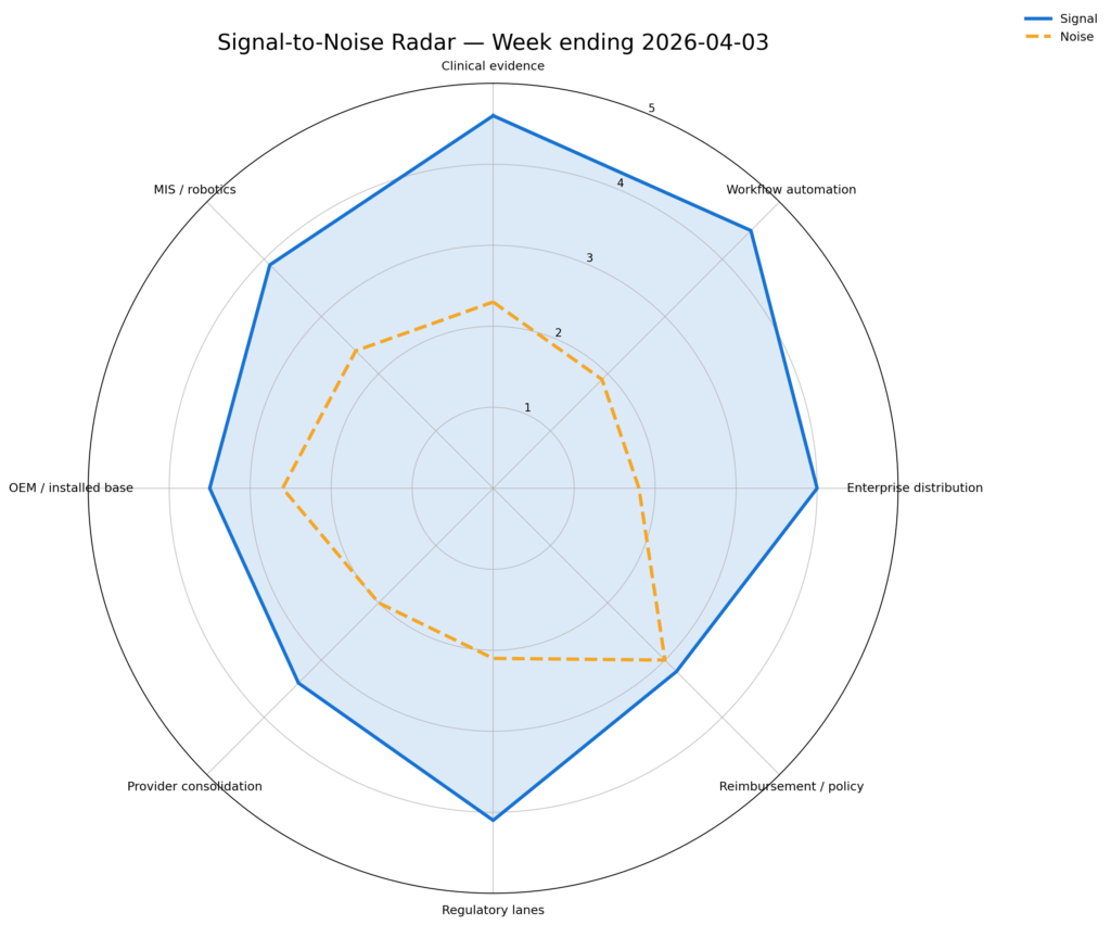 The clearest signal sat in clinical evidence, workflow automation, and enterprise distribution. The noisiest lane remained reimbursement/policy, where operational friction increased but no broad payment unlock offset it. Capital-market funding also remained secondary to routability: Lucida’s financing was relevant, but still less commercially decisive than the week’s workflow and distribution signals.