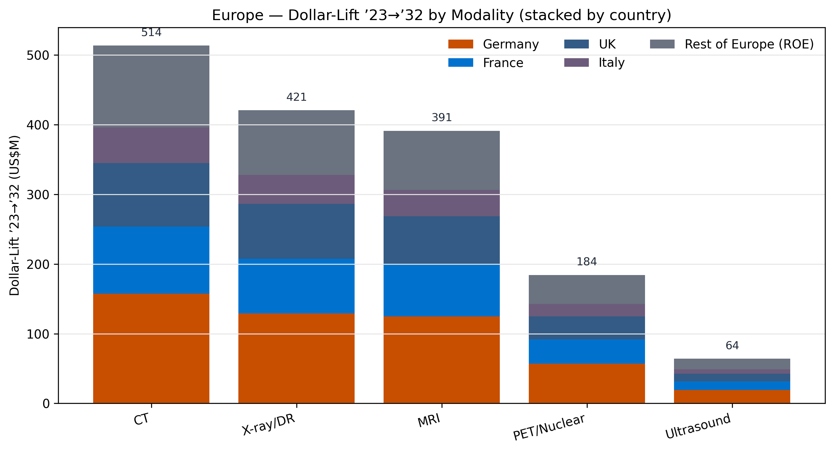 A: By 2032, Europe’s biggest modality pools are CT (~US$552M), X‑ray/DR incl. mammography/DBT (~US$466M), and MRI (~US$430M), with PET/Nuclear (~US$205M) as an important high-value niche.